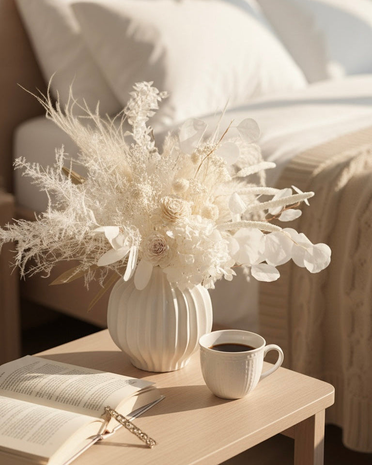 Erinnern Sie sich an den leeren Platz, der sich nie ganz richtig anfühlte? Das ist das 'Vorher.' Stellen Sie sich jetzt vor, er ist gefüllt mit zarten, ewigen Blüten, die ständige Freude bringen – das ist das 'Nachher.' Unsere Trockenblumen-Kollektionen verwandeln übersehene Räume in Gesprächsanlässe und leere Wände in künstlerische Aussagen. Das ist nicht nur Dekoration; es schafft Momente der Schönheit, die bleiben.