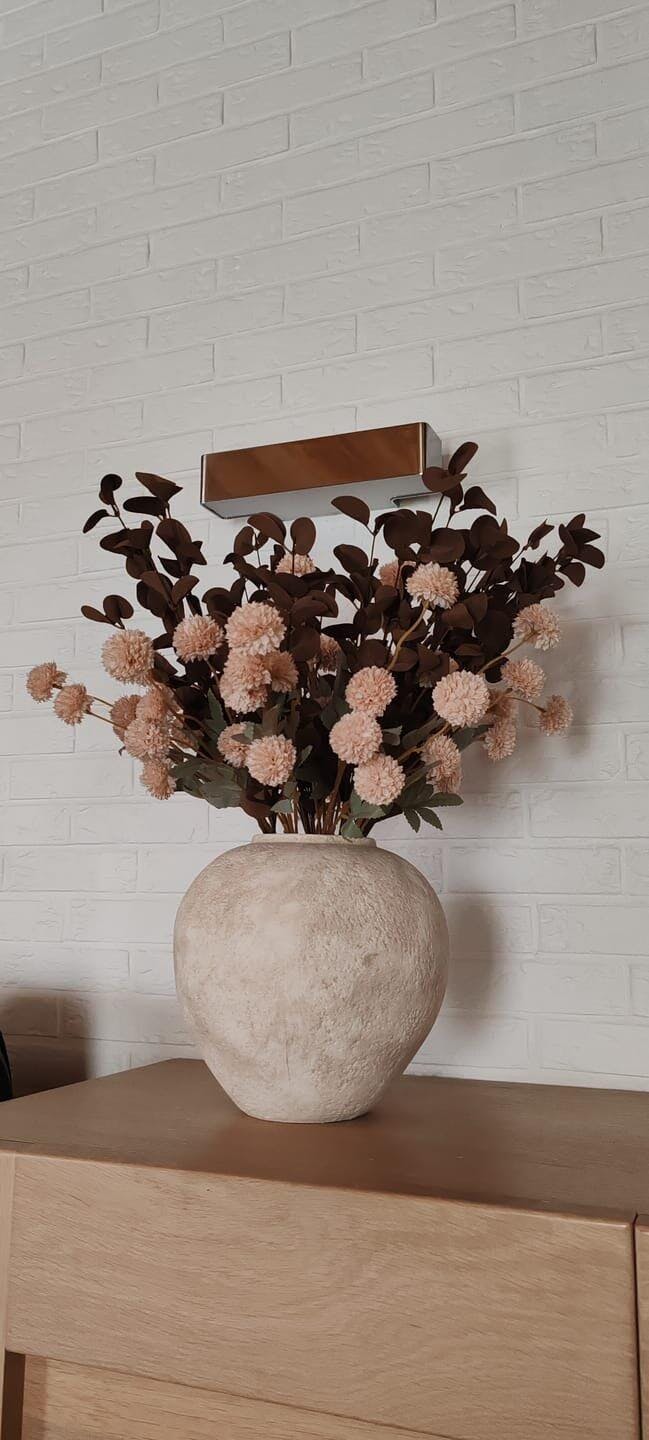 Dieses Kunstarrangement enthält eine Mischung aus unserer Kunst-Kiku-Blume in Creme und braunem Eukalyptus für einen mutigen, luxuriösen Look.