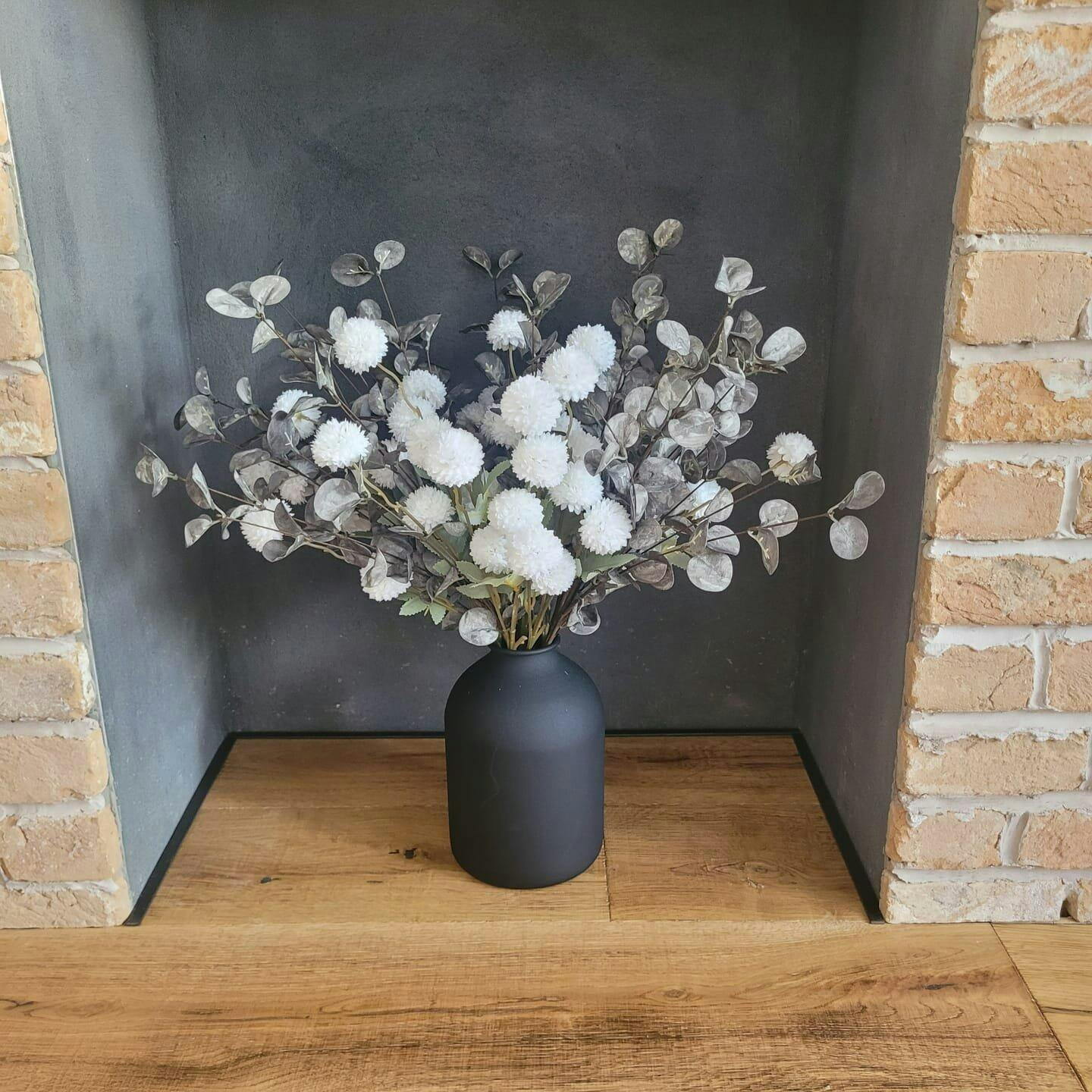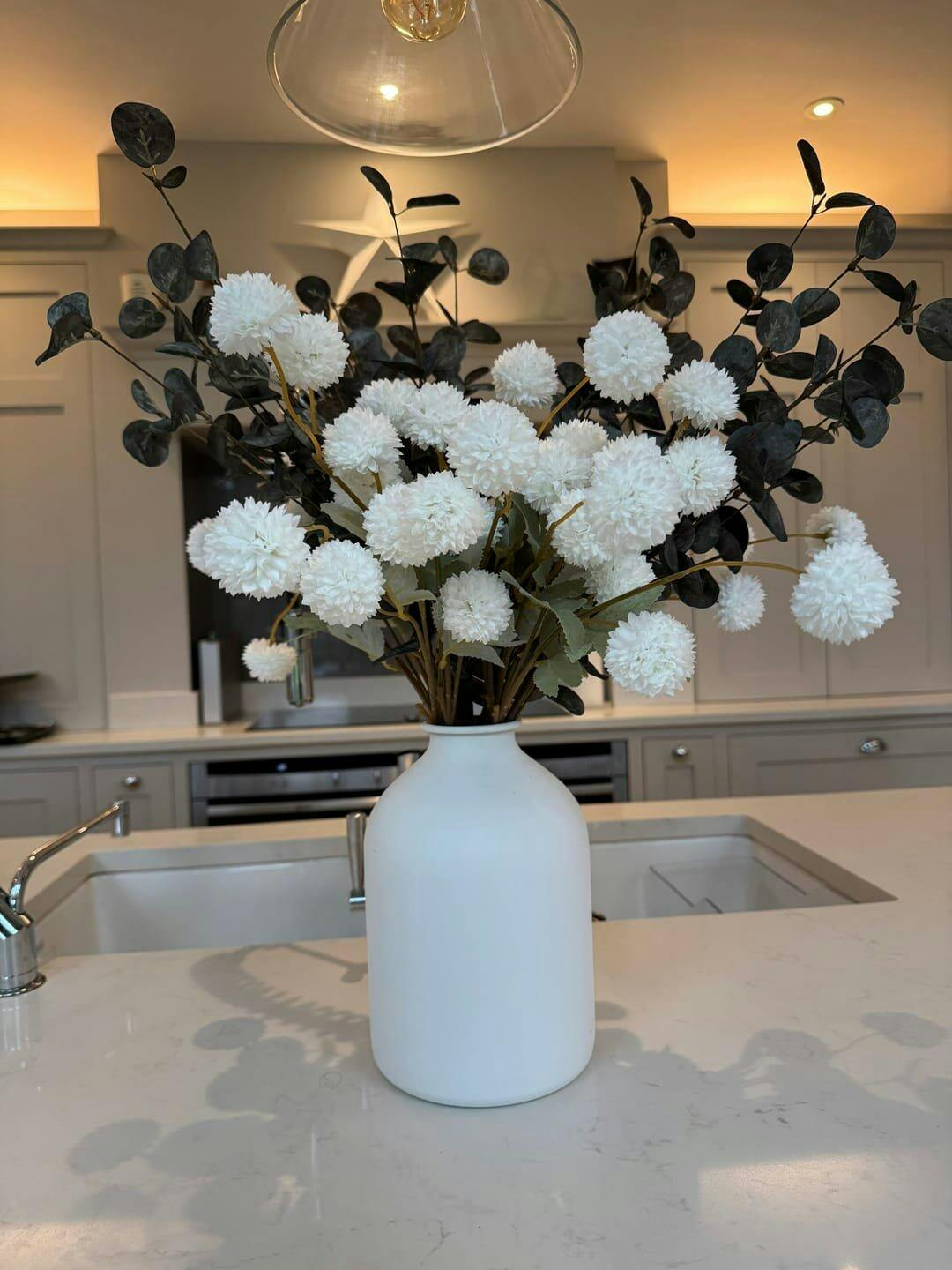 Dieses künstliche Arrangement enthält eine Mischung aus unserer künstlichen Kiku-Blume in Weiß und grünem Eukalyptus für einen mutigen, luxuriösen Look.